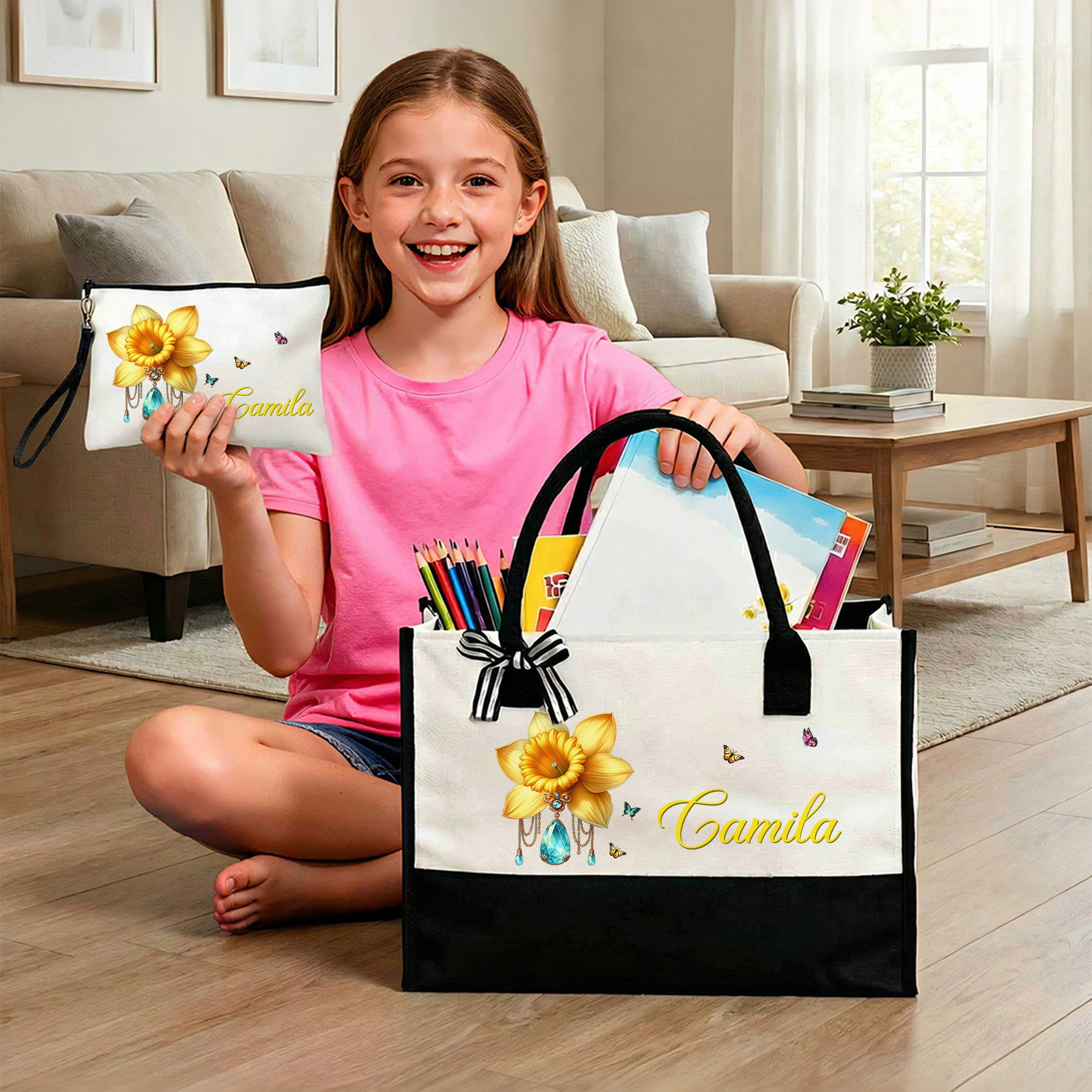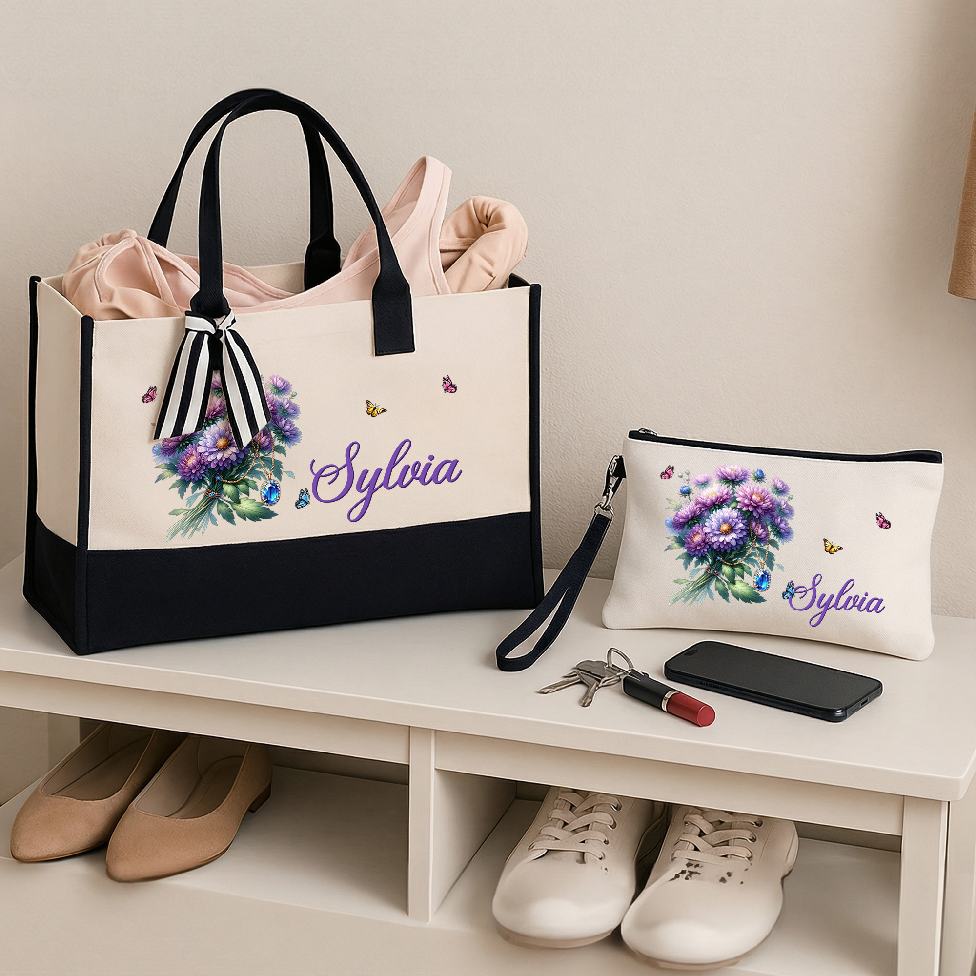 | Style | Custom Name Gemstone Birth Flower Tote Bag with Makeup Pouch |